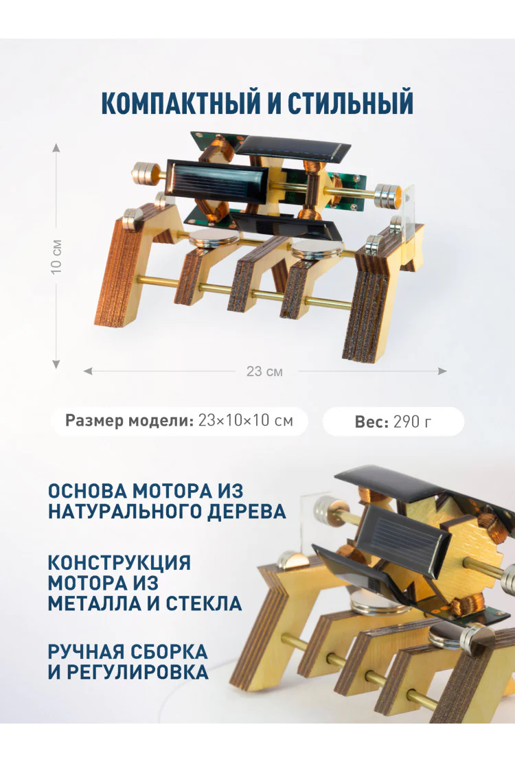 Левитирующий двигатель созданный по принципу Мендосинского мотора. Основа из шести частей, четыре солнечные панели и четыре медные обмотки на легком воздушном роторе. Размер модели 11х5,5х5 см, вес 150 грамм. При изготовлении использованы дерево, металл и стекло.