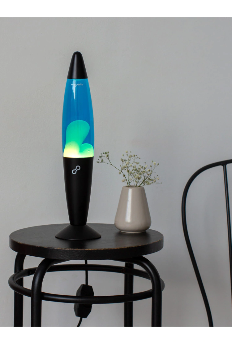 Лава лампа Amperia Rocket высотой 35см с белым воском, синей жидкостью на подставке чёрного матового цвета.